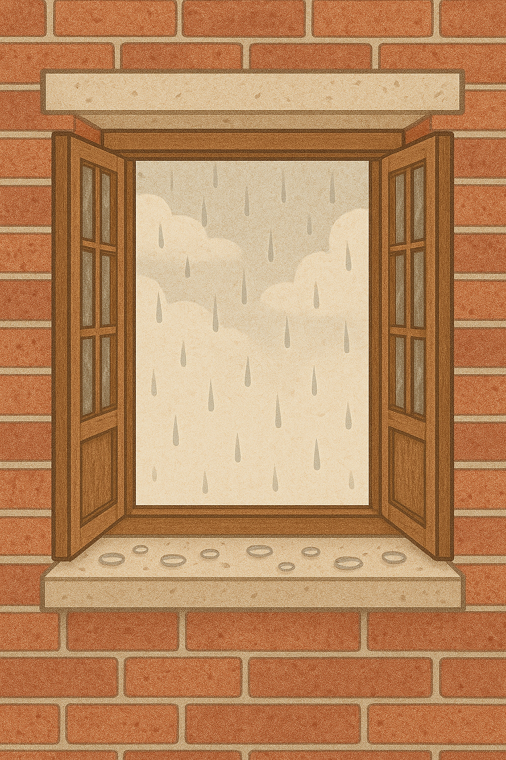 雨聲還在,但比早上小了許多。水珠順著木窗的玻璃慢慢往下滑,有一滴,卡在窗角,一直沒掉下來,像在等一個看不見的風。